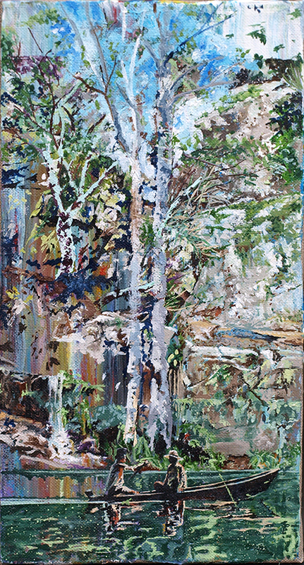 oleo sobre el detrito de una madera usada a modo  de paleta por un alumno 28 x 33 cm.